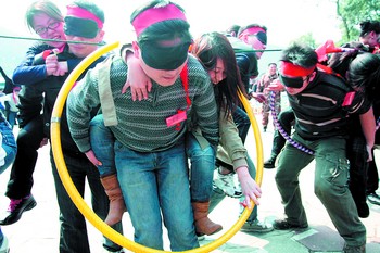 由于老公们被蒙上了眼睛,在过第一关时就摔倒了10对夫妻,最有意思的是钻呼啦圈,背上的老婆已经穿过了呼啦圈,而老公却“卡”在里面进退两难。加油鼓劲的近千名游客捂着肚子笑翻了。最后,郑先生和王女士夫妇获得了第一名。