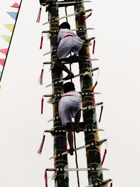 本报湛江讯记者袁增伟,通讯员李土寿、颜荣生摄影报道:昨天,湛江市麻章区太平镇麒麟村村民做“年例”,表演了一番民间绝技爬刀梯(上刀山),令人大饱眼福。