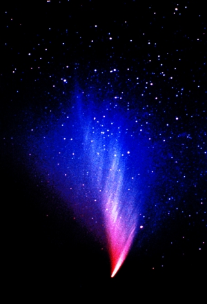 彗星说是一颗“星”,其实它是一种奇怪的东西,占有质量绝大部分的真正核心很难看见,而只占质量极小部分的外围却光彩夺目。彗星的质量非常小,就连大彗星的质量也不到地球的万分之一,绝大部分集中在彗核部分。彗核的平均密度为每立方厘米1克,相当于地球上的水。彗星物质主要由水、氨、甲烷、氰、氮、二氧化碳等组成,而彗核则由凝结成冰的水、二氧化碳(干冰)、氨和尘埃微粒混杂组成,是个“脏雪球”。