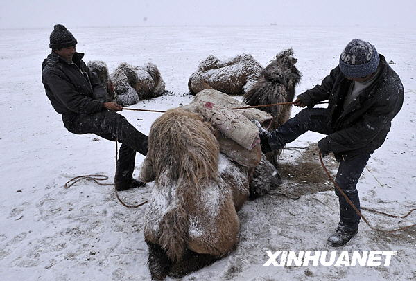 3月9日一大早,新疆伊犁哈萨克自治州的哈萨克族牧民在骆驼上捆绑行李,准备新一天的转场。新华社记者 沈桥 摄