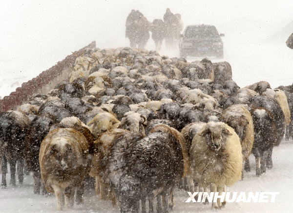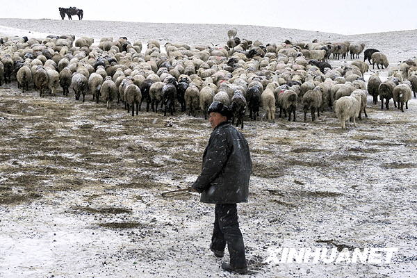 3月9日,新疆伊犁哈萨克自治州的哈萨克族牧民在风雪中赶着羊群转场。