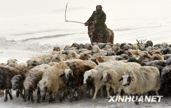 3月9日,新疆伊犁哈萨克自治州的哈萨克族牧民在风雪中赶着羊群转场。新华社记者 沈桥 摄