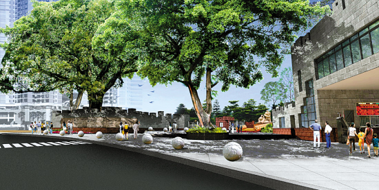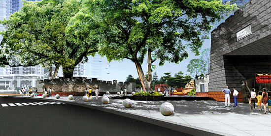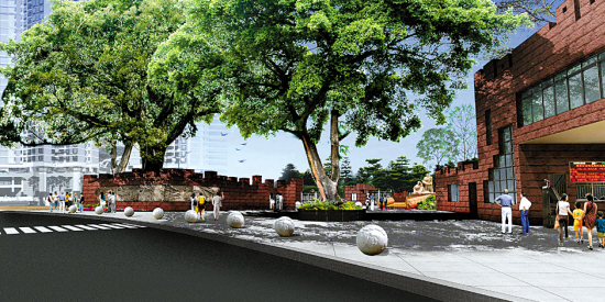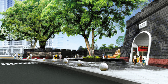为发掘小北门历史信息,越秀区最近正计划在越秀公园东门处复建小北门,同时,利用越秀公园前广场,取消旁边休闲会所停车场,扩大节点空间,用抽象写意的手法,塑造“小北寻迹”绿化广场,使其环境体现古城墙与城楼的整体概念。