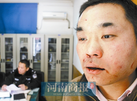 “我们一起吃完饭,他们拿了2600元钱给我,我把发票给了他们,我在数钱的时候,他们一把把钱抢走,然后拳头和啤酒瓶就朝我头上砸过来了。”说这话时,王进府嘴里还残留着淤血,头顶有一块鹌鹑蛋大小的伤口。