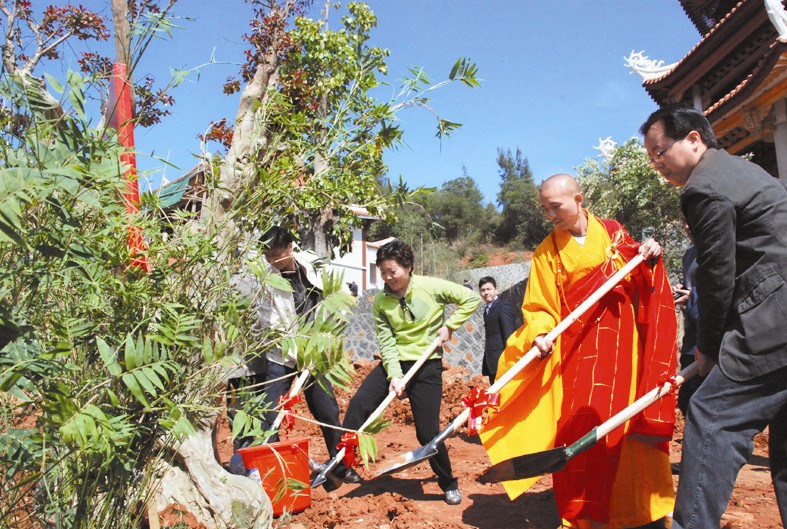 昨日上午,春光和煦,泉州团市委联合市青年联合会、市青年商会、市青年志愿者上千人在泉州南少林寺种植“少林青年林”,吸引了众多社会知名人士和热心市民前来捐植,为名城古刹添新绿。作为回报,南少林武僧向广大市民表演了精彩绝技。郭冰德 文/图