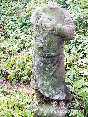 记者观察发现,养鸡场基石沧桑。陪同的文物专家刘勇介绍,基石乃庙宇基石。旁边草丛,有不少雕花精美的石制品和石像头。几个壮汉立起一尊无头断臂石像,显示为男像,穿窄袍,束腰带,玉树临风。村民唐永才介绍,这是庙里供奉的梁山伯和祝英台像,文化大革命时期遭破坏,女像前年被人请走,供奉于私人家中。
