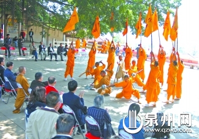 昨日,香港福建书画研究会秦岭雪、孙立川、林鸣岗、林坚章、林天行、蔡健如、蔡金章等20多名书画家专程到泉州少林寺参观。泉州少林寺武僧团作了精彩的武术表演,引得嘉宾阵阵喝彩。 (廖培煌 陈小阳 摄)