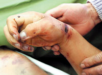 一位目睹了尸检全过程的死者亲属事后如此描述:徐梗荣两个手腕上有清晰的环状伤痕,两只手掌肿得像馒头。法医发现头盖骨内的脑子出现水肿。另外,死者大腿内部两侧有淤青,切开全是血,小腿上也有淤青。