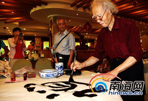 南海网3月20日消息(本网记者李永金特约记者陈文武摄影报道):台湾知名书法教育家任汉平携夫人昨晚下榻南山景区,今晨,在游览南山景区时,即兴挥毫泼墨留下“六时吉祥,圆融,宏观,禅——流水共禅心、空山亦佛性,禅——宝伐渡迷津、法轮光大地”墨宝。据悉,任老此次琼岛行是在海南进行为期一周的巡回行草艺术讲座。