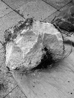 本报记者臧培丽摄影报道 昨天下午,记者在上海宾馆公交站台上见到一个约30岁的男子在大声叫卖所谓的野生纯天然蜂蜜。记者走近后发现,该男子所说的“野生蜂蜜”为黄褐色结晶块状,表层被一层青苔包裹,散发有淡淡的野花香味。该男子一边大声吆喝着“纯天然野生蜂蜜,能止咳化痰,美容润肤,增强体质”,一边还用刀撞击蜂蜜块,发出石块相撞般坚硬的声响。