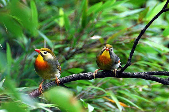 资料图片:红嘴相思鸟雌雄鸟之间形影不离,终身实行“一夫一妻”制,因此有爱情鸟的美誉。红网长沙3月22日讯(记者 谢伦丁 通讯员 周灿英)提起象征爱情的鸟类,人们自然会联想到鸳鸯。其实,主产于湖南的红嘴相思鸟,因其“一夫一妻”制而同样享有“爱情鸟”美称。华丽的毛羽、婉转的叫声更是让它在两年前的海选中胜出,被评为湖南省鸟。