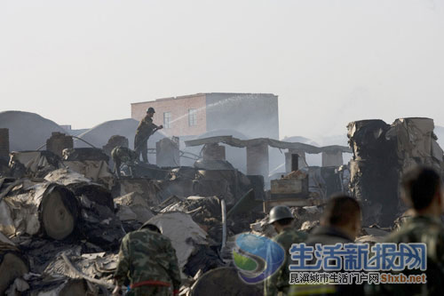 火灾现场一片狼。 本报记者高永永在拍摄此照时不慎摔成重伤