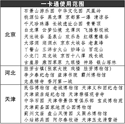 据介绍,“京津冀旅游一卡通”共吸纳了京津冀三省市的58个旅游景区和文化景区,京津冀各城市市民购买年票可在一年内不限次数免门票进入景区旅游休闲,同时享受各种优惠旅游消费。58个景区的零售门票单次总价为1000多元,而“京津冀旅游一卡通”的售价为在校学生和老人100元,普通市民130元。消费者购买后一年内,可不限次数游览规定中的三地景区。