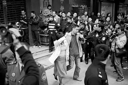 11时10分,特警押出一名年轻男子,穿着牛仔裤白色上衣。接着,民警带出里面3名员工,一名女子一步冲上去抱住妈妈,哭了起来。