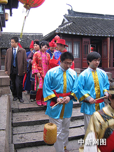 今天一早,古镇周庄已是人头攒动,张厅、沈厅张灯结彩。良辰吉时一到,长衫、马褂、礼帽打扮的新郎驾着锣鼓震天的迎亲船由水路驶来,吸引着河两岸的游人来回奔走争睹。随后红盖遮面、身着花衣花衫、足蹬绣花鞋的新娘出阁、上花船、摇快船、拜堂、闹洞房、走三桥、喝喜茶、夫唱妇随“双推磨”……热闹的水乡婚礼吸引了无数游人挤身观赏,小情侣们更是眼红心谗。