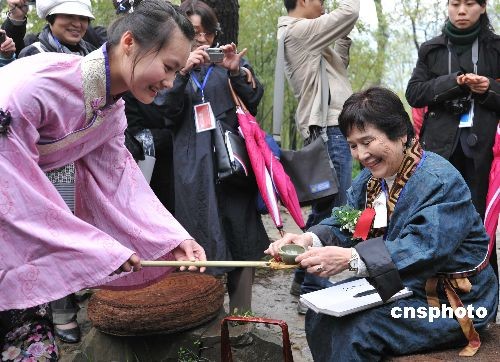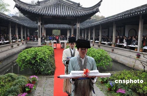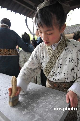 书童正将各地来朝圣的书法代表作品晋献到绍兴兰亭右军祠内的王羲之像前。中国书法家协会副主席、浙江省书法家协会主席朱关田为第二十五届中国兰亭书法节开笔。中新社发 袁云 摄版权声明:凡注有“cnsphoto”字样的图片版权均属中国新闻网,未经书面授权,不得转载使用。中外书法家正在进行仿古曲水流觞雅趣活动。古代仕女装束的姑娘正将随水漂流的酒觞递给书法家。中新社发 袁云 摄版权声明:凡注有“cnsphoto”字样的图片版权均属中国新闻网,未经书面授权,不得转载使用。