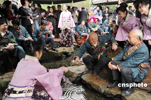 中外书法家正在书法之乡绍兴兰亭右军祠内进行书艺交流。日本书法家正在绍兴兰亭参加仿古曲水流觞雅趣活动。中新社发 袁云 摄版权声明:凡注有“cnsphoto”字样的图片版权均属中国新闻网,未经书面授权,不得转载使用。【更多图片】