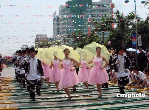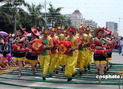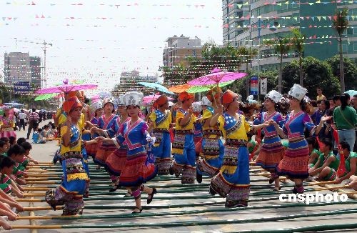 三月二十九日,是中国最大的少数民族——壮族富有民族特色的传统节日“三月三”歌圩。“中国壮乡”广西南宁武鸣县一千多名壮族男女身着鲜艳的民族服装,排着整齐的表演方阵在竹杠阵内,和着鼓声欢乐起舞。被现场气氛感染的游人也纷纷加入其中,整个表演场地其乐融融。