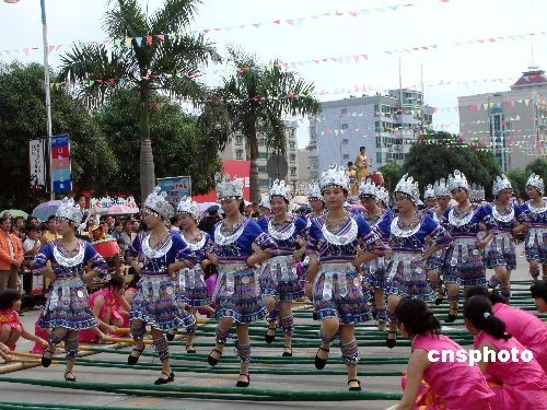 图:广西壮族男女“三月三”欢跳竹竿舞