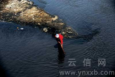 后所镇小冲村,洗煤厂的污水排放到河里,村民在乌黑的河水中捞煤浆用作燃料