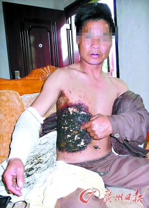 随后被送往镇卫生所的林先生因伤势过重被转送到了韶关市第一人民医院。医生发现他的右胸腹部、双上肢、面部都被火焰烧伤,经诊断为二级烧伤。