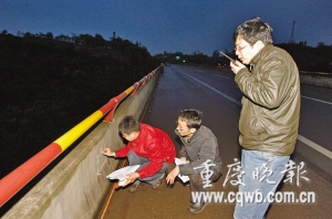 石坪1号桥跨度百余米,承载拖挂车的极限是120吨。在桥头,七八个来自重庆公路工程检测中心的工作人员正紧张忙碌着,监测桥梁状况。桥中护栏旁竖着一根带刻度的标尺,两台精密的电子仪器对准刻度标尺,桥身还装了传感性非常精确的芯片。