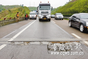 临近沙坪收费站路段时,前方突然出现一个小餐桌大小的坑凼。货车被迫紧急刹车。这个最深处仅三四厘米、平常所有车辆都可正常通过的坑凼,此时竟让货车无法越过。货车开始后退,穿特地切出的缺口绕行。