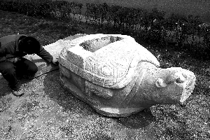 昨日,东城区文物保护部门的工作人员说,“大龟”是赑屃,又名霸下,外形似龟。一般在各地的宫殿、祠堂、陵墓中均可见到其背负石碑的样子。