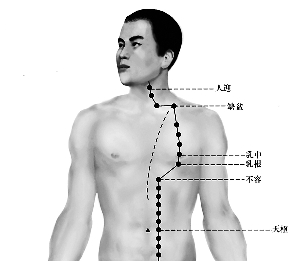中医在认识人体的时候,也是遵循天地人的观念,人体上的很多穴位的名称都以天地人来命名。人体肚脐以上为阳,肚脐以下为阴,阴阳沟通的枢纽就在肚脐旁开两寸,此穴位名为天枢穴(见图)。