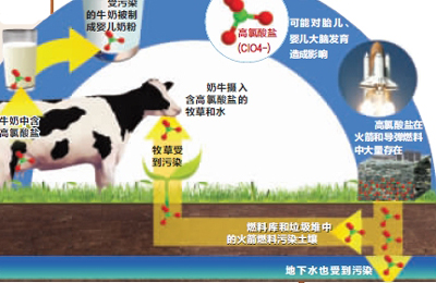 据报道,奶粉受高氯酸盐污染,是航天燃料污染环境恶果。高氯酸盐是一种有毒化学物质,其自然存在于土壤之中的比例很低,然而在发射航天飞船、人造卫星和导弹所用火箭的燃料中则大量存在。来自燃料库和垃圾堆的火箭燃料会污染接触到的土壤,并通过渗透到地下水的方式扩散。奶牛吃了被污染的土壤中长出的青草,或者喝了受污染的水,产出的牛奶中的高氯酸盐含量就会超出正常标准。用被污染的牛奶生产的奶粉,也就难免含有高氯酸盐。过量的高氯酸盐会干扰人体的甲状腺功能,导致发育迟缓,对婴儿形成危害。
