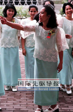 香港目前有约90%的家庭佣工来自菲律宾,图为在香港的菲佣穿着传统服装参加休息日聚会。 本报记者 沈桥/摄