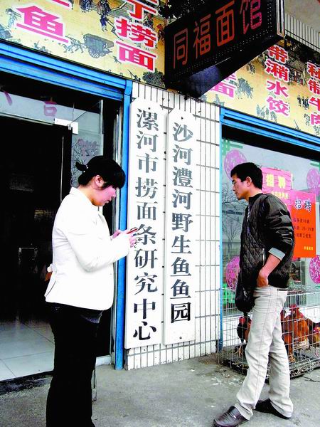 昨天上午,记者赶到金山路中段,看到一家饭馆门口挂着白地黑字的“漯河市捞面条研究中心”招牌。