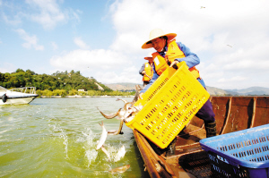 渔政部门向滇池投放鲢鱼。记者唐林摄