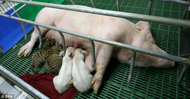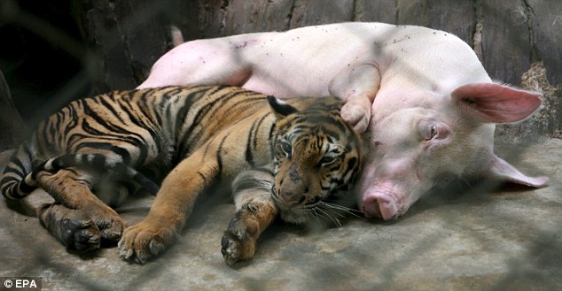 泰国动物园里虎猪互哺相依偎的温馨场面(组图)