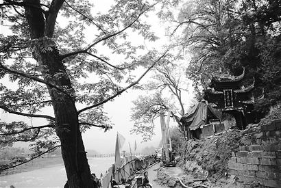 二王庙被蓝板围得扎实,要进入施工地,只有从背面靠江的路过去。确认身份后,工人给记者戴上了安全帽,这是震后记者首次走进二王庙,工人特别叮嘱只能呆几分钟。两辆吊车正在工作,从吊车下钻过,才走到二王庙靠江的背面,二王庙里一些倾斜的建筑构件已被绳子固定好,大部分建筑构件都铺上了蓝色塑料布。“二王庙靠江位置,你看得见的大坑是抗滑桩孔。”樊拓宇说,二王庙目前重点进行的是地质灾害治理工程,然后才是古建筑群的重建修复,整个二王庙维修预计3年,力争两年完成。“这个地质灾害治理很重要,设计要求是再遇到大地震,并伴随大洪水,二王庙所在的古滑坡体不会整体滑入江中。”二王庙大、二殿维修方案设计已评审通过,正在加紧进行其他文物建筑维修方案设计。