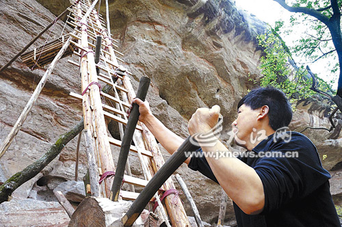 笔者看到,夏瑶年已把基座及绞动轮固定好,并将4节云梯吊上去绑扎好。于是,他用绞绳将第5节云梯绞上去,并爬上云梯用绳索将其绑牢,不使其摇晃。据了解,竖在空中的云梯约有15米高,并分三层分别用2根支撑杆顶住岩石,将云梯撑住。