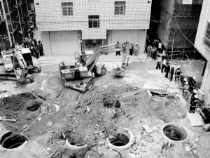 居民康女士告诉记者:“这些深井是为了再建一栋十三四层高的居民楼而开挖的楼基桩井。该楼建成后,与四邻居民楼相距都只有几米远。这次正是由于向一口桩井浇注水泥混凝土时,不慎‘胀’破井壁,将相邻两米左右的另一口桩井中的青工埋了……”