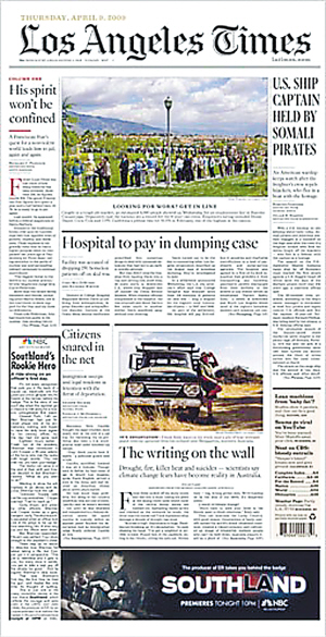 4月9日出版的《洛杉矶时报》头版左下位置,刊登了美国全国广播公司(NBC)的新节目“南方”(Southland)的文字广告。广告的标题和版面布局很像一则新闻专栏。在报纸头版的底部,还有一则“南方”的图片广告,与文字广告组成“L”形。广告的标题上部有NBC图标和“广告”字样。