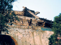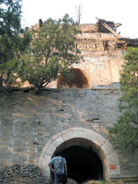 走过残破的三座门之后,在苍翠的古树之间露出明楼的一角,木质的横梁勉强搭在已经腐朽的廊檐间,看样子一阵大风吹过就有可能从20米高的楼上滚落下来。高德忠说,每逢雨水大、风大的时候,明楼上就不时有东西落下来。而在明楼的门洞里垒放的一堆腐朽的木构件都是明楼顶部自然滚落下来的。“晚上和下雨的时候,护陵寝的人都不敢到明楼附近,因为损坏的很严重了,不知道什么时候会砸落下砖石、木梁。”老高对茂陵很有感情,记者进入茂陵的时候,他一再叮嘱不要碰坏里面的文物建筑:“经不起任何破坏了!”