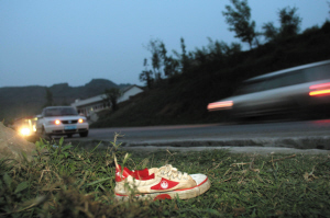车祸现场留有一只运动鞋 记者 张玉杰 摄