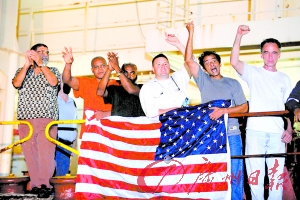 “马士基亚拉巴马”号眼下停靠在肯尼亚蒙巴萨港。船员兴奋地又叫又跳,在桅杆上高高升起一面美国国旗。