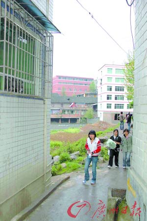 远处红色建筑是玉淮中学,附近租房住的学生们每天都要经过狭窄的通道,道路泥泞。