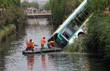 昆明一公交车坠入明通河 造成10人伤1人亡(组图)
