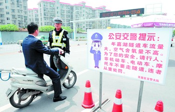 昨日,芙蓉区交警大队五中队在年嘉湖隧道东侧入口处设置了“温馨提示牌”。中午,在隧道口执勤的交警正在劝导一名电动车驾驶人绕道行走。小刘军 摄