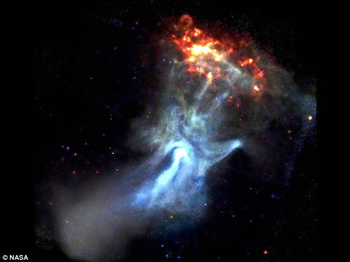 拍到的“上帝之手”中,幽灵般的蓝色云彩看起来形成了向外伸展的大拇指和其他四指,正要去抓一块燃烧着的煤块。科学家解释说,当一颗恒星爆炸成为超新星时,会产生一个高速旋转的直径约为19千米的脉冲星,其内部的白斑形成手腕。脉冲星释放出巨大的电磁能量,产生巨大的尘埃和气体,宽度可以达到150光年。红色的圆盘是分离的气体云。当能量从脉冲星向这块气体云传递时,便形成了五个手指。