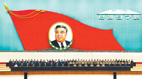 4月14日,朝鲜劳动党中央政治局委员、最高人民会议常任委员会委员长金永南在平壤举行的纪念朝鲜已故国家主席金日成诞辰97周年(4月15日)的中央报告大会上表示,如果美国与韩国胆敢挑起战火,朝鲜将“给予无情的惩罚”。这是朝中社14日播发的金永南出席纪念朝鲜已故国家主席金日成诞辰97周年中央报告大会的照片。