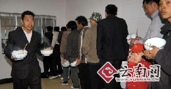 昆明救助站里的被救助人员排队打饭。记者 江洋 摄