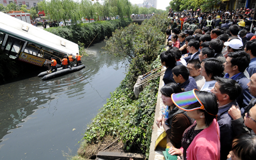 30多岁的苟朝军是小街附近一家商店的员工,短短3个多月,他已在该路段目睹了七八起车祸。昨日11时40分许,他正准备吃饭,马路上突然传来一声巨响,扭头一看,一辆90路公交车“发疯”一般冲向路边的明通河。在将河堤上一棵柳树连根撞起后,公交车齐腰挂在河堤上,车头右侧入水。马路上还停着一辆银白色轿车,车头严重变形,油箱正在漏油。苟朝军立马跑到公交车边,车上多名被困乘客,正在大声呼救。“只要重心有点变化,公交车就可能翻入河中!”