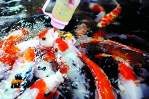 4月15日,几十条会“吃奶”的鱼亮相沈阳一商场的观赏水池。据介绍,这些鱼为日本锦鲤,嘴特别大,经特殊训练后可用装有营养液的婴幼儿奶瓶进行喂养。图为鱼儿争先恐后地“喝奶”。