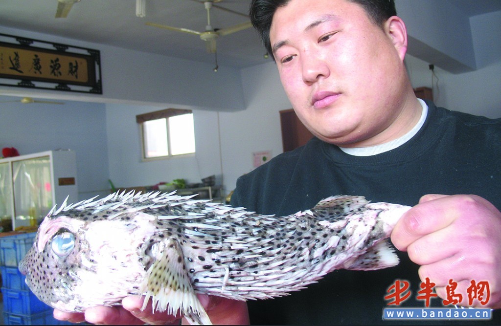 16日上午9时许,记者闻讯赶到即墨市泰山一路南端的浩恒纭海鲜餐馆时,店老板姜先生和厨师们正在对这条怪鱼进行“竞猜”。记者看到,这条鱼头大身子小,它的眼又圆又大,呈蓝色,鱼皮上还规律地长满黑色的斑点。该鱼浑身上下都长满了 1.5厘米至2厘米长的刺。这些刺呈白色,且十分尖利 ,和刺猬身上的刺几乎一样。姜先生介绍 ,这条鱼长42厘米,重3.4斤。